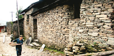 石头是塘房村的财富,这里产的石头像千层的油饼,用扁锤沿石角一敲,就能起下一大块。一层一层的石板,像一本厚厚的书,层次之间毫不粘连,只要你乐意,就可以随意地翻阅。村民们建房就地取石,不做任何二次加工,没有污染,无需能源。石材是天然具备的,木材是自然生长的。墙是石头砌的,支离的碎石,平面往外地块块砌起,不用半点沙灰水泥粘合。石墙顶上架木椽,木椽上面铺石板。石板从檐口铺起,块块叠压,至脊而收。村里的老人说,这样独特的石板房,雨季,屋顶石板遮挡,水不入室。晴天,满室潮气蒸发,沿缝隙罅漏四散飘逸,室内很快又干爽如初,居住于内,冬暖夏凉。