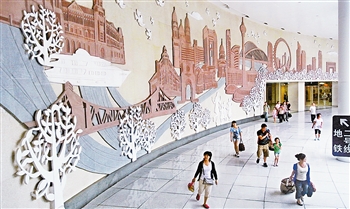 随着天津站后广场轨道换乘中心的投入使用,多组体现天津独特魅力的大型浮雕亮相,成为展示天津城市形象迎接八方来客的亮丽名片。图为长达106米的大型彩色环绕形石材浮雕《城市风景》大气恢弘,体现了人与自然和谐共处、生态平衡、经济发展的和谐新天津。