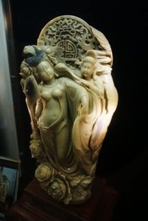 封门石作品《贵妃出浴》,由中国工艺美术大师张爱廷创作,艺术再现了贵妃当年的生活情景。青田石雕讲究因材施艺,依色取俏,此件作品的亮点便是贵妃秀发的紫罗兰俏色,不仅展示了作者娴熟的雕工,更给作品增加了灵气。