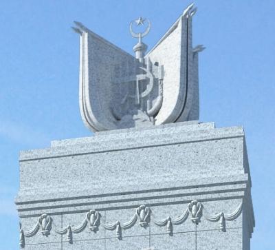 据介绍,墙面浮雕和花饰,均用芝麻白石材。红旗因为是直径3米多的正方体,找不到那么大的石头,以玻璃钢取代,外喷漆仿白麻石,达到整体统一。