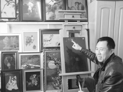 11月20日,记者来到了职工街27栋的吕庆环家中,房间靠墙的架子上挂满动物和山水画。吕庆环自豪地说:“这些都是我的作品,不是画的,是我一下一下雕出来的,叫做影雕。 ”