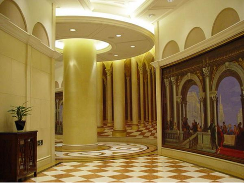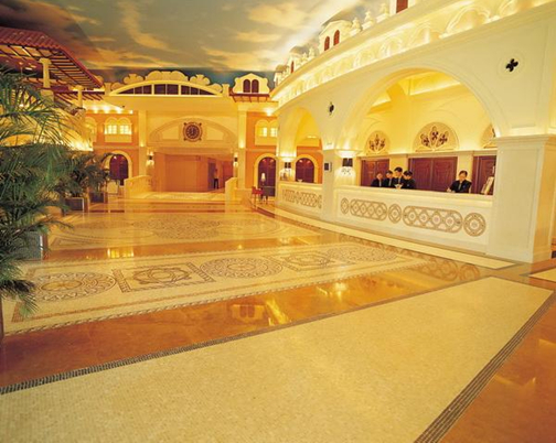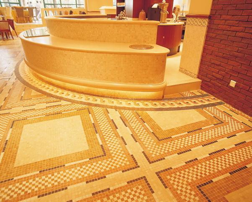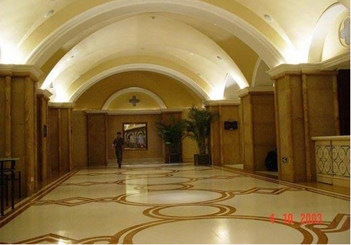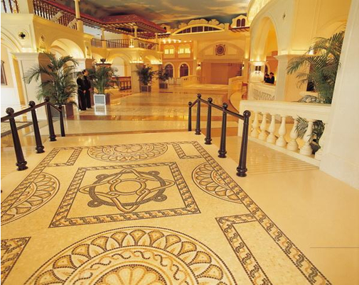 石材马赛克工艺和石材水刀拼花相互关联的,甚至于在国外,石材水刀拼花还是属于石材马赛克工艺的范畴。在这里,威尼斯酒店的墙面和地面便是一个典型的例子可以说明。这里的墙面和地面由小颗粒马赛克来装饰,因为小颗粒马赛克有着灵活的调整和重组优势,可用于有界面区分的平面类的效果隔断或者收边部分,它的整体拼图装修效果远远胜于光面石材拼花。