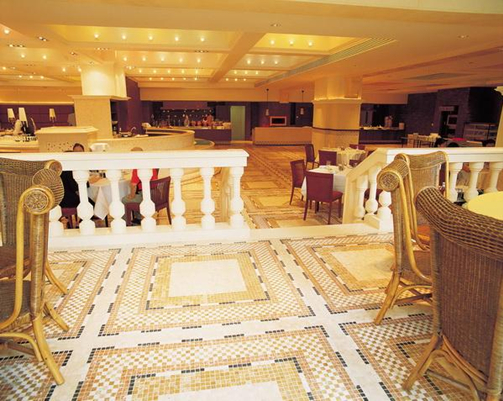 威尼斯酒店的餐厅地面,全部采用石材马赛克铺饰。如果不经意看去,竟像是编织好的地毯般柔软。图案简单却不失艺术欣赏价值,色彩虽只有黑色白色黄色却不单调乏味,形状虽然只是平常正方形或长方形却在不断的重复中展现了力量美和方正美。
