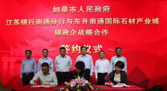 活动现场,如皋市政府、江苏银行南通分行与东升南通国际石材产业城签署了银政企战略合作签约仪式,协议约定江苏银行南通分行对东升石材产业城入园企业授信30亿元。