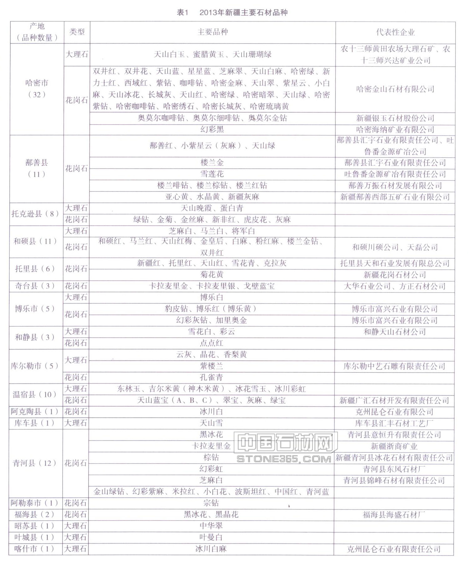 新疆石材多为名贵品种。天山兰、芝麻翠、天山冰花、新疆红、双井红、双井花、菊花黄、鄯善红、卡拉麦里金、咖啡钻、波斯银麻、天山雪莲、天山玫瑰、天山大白花等先后被列为“全国名优特品种”。“天山雪莲”结晶程度高、结构致密、光泽度高、块度大、拼接性能好,颜色、花纹、结构美观均匀、在国内独具一格;“卡拉麦里金”,其色泽高雅和质地优良,可与国际流行的“菊花黄”、“米兰黄”相媲美,深受市场青睐,产品畅销上海、杭州等长三角地区,主要用于高端房地产商用项目的开发;“和硕红”颜色红润,与“印度红”非常接近,属于优质名贵品种,见表1.