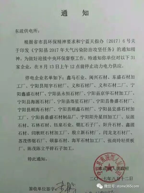 宁阳县镇政府根据省市县环保精神要求和宁蓝天指办(2017)6号关于印发《宁阳县2017大气污染防治攻击任务》的通知精神,为做好迎接终于环保督查工作,特通知以下31家企业,在8月13日上午12点前停止动力电力供应。宁阳县的老板们快来看看有没有你家的名字!!