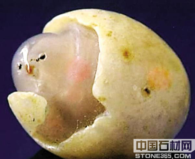 现收藏于北京朝阳区人民政府,小鸡出壳为天然玛瑙。此石似一只色泽淡黄毛茸茸的小鸡从蛋壳内向外张望伸头欲出,形象逼真,色泽艳丽,“小鸡出壳”整体的造形以及局部的体态都与实物相仿。