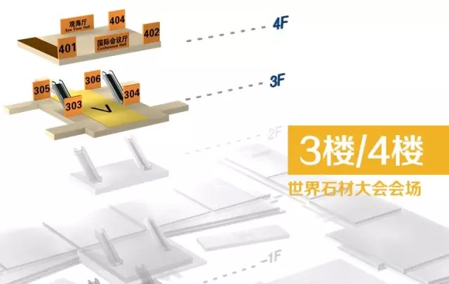 世界石材大会会场位于C厅上方,从G厅乘坐手扶梯可至。