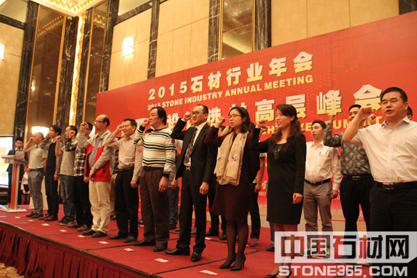 会议第二项内容是对过去一年重质守信会员企业进行表彰,在全体参会嘉宾见证下,环球石材(东莞)有限公司等25家获得《2014-2015年度重质守信示范企业》称号企业负责人依次走上主席台,对着“重质守信示范企业”旗帜许下庄严承诺,表示将在石材行业中以重质守信为己任,为振兴中华民族工业而奋斗。大家同声许诺,场面非常感人。