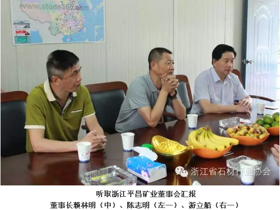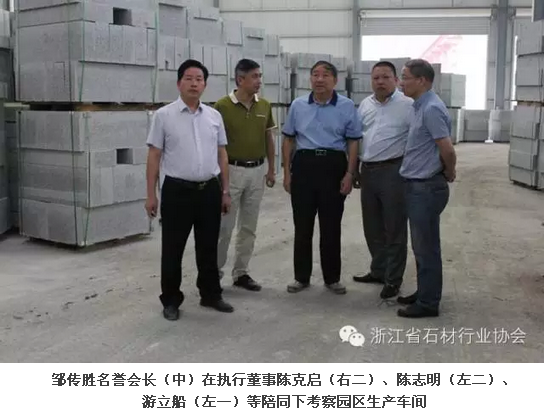 在浙江平昌矿业石材园区,邹传胜名誉会长在董事长赖林明、执行董事陈克启、陈志明、游立船等陪同下首先考察了园区污水综合治理设施和运行状况;随后,又仔细察看了园区布局、设备配置、产品加工和现场管理,实地踏勘了浙江平昌矿业矿山开采平台,并详细了解了当地石材产业发展、市场销售和工程应用情况。