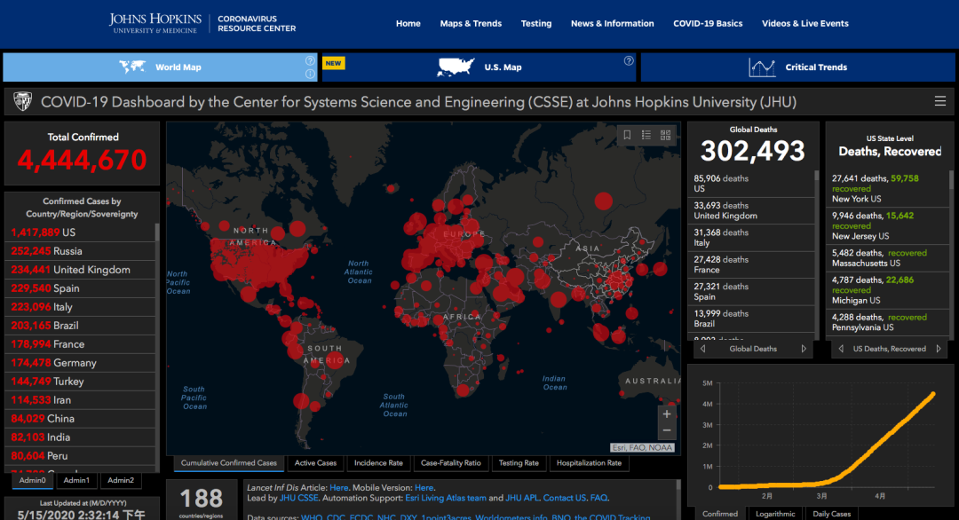 (根据美国霍普金斯大学的数据,截止北京时间15日下午14时32分,全世界新型冠状病毒肺炎疫情累计感染病例已经达到4444670例,感染人数前十的国家依次是美国、俄罗斯、英国、西班牙、意大利、巴西、法国、德国、土耳其、伊朗)