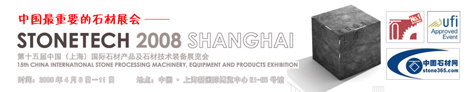 第十五届中国(上海)国际石材产品及石材技术装备展览会 英文名称:STONETECH 2008 展出地点:上海.浦东新国际博览中心E1、E2、E3、E4、E5号馆(浦东龙阳路) 展出面积:75,000平方米 展出日期:2008年4月8日至11日(共四天) 主办单位: 中国国际贸易促进委员会建筑材料行业分会 中国石材工业协会 北京华港展览有限公司 支持单位 中国国际贸易促进委员会 中国建筑材料工业联合会